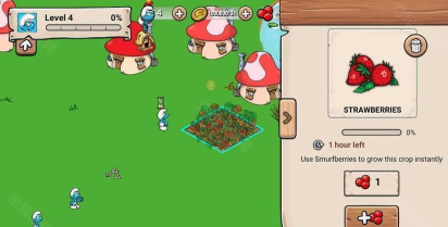《蓝精灵村庄》中玩家可通过种植农作物、参与迷你游戏(如馋馋的烤蛋糕、蓝爸爸的药水配置)获取资源,加速村庄成长。