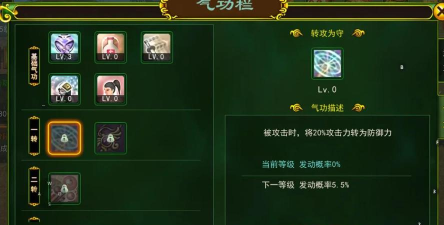基础气功 金钟罡气:满级20级,加满获得20点防御提升,性价比不高,但是枪客防御低,推荐加满,后期可以洗掉. 运气疗伤:提高金疮药恢复量,没必要加. 连环飞舞:适合平A流,枪客走技能流,不需要加. 狂风万破:提升怒气时间,必满技能,前期点比较紧张,可以适当舍弃.后期加满,不在意防御的大佬玩家可以选择优先加满. 一转气功 转攻为守:被攻击时,将20%攻击力转化为防御力,概率触发技能,不能在怪物堆里抗...