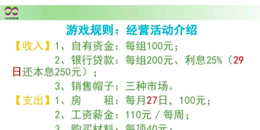 第一重 (基本的)完整表达 这是最基础的一个标绍新的道具和人物,并说明不再使用的道具:诚信超市和情景卡等.接下来介绍沙盘2的规则,将学员分红、蓝、绿三组,其中红组为零售商,蓝绿均为制造商,依旧生产标准帽.这其中,蓝绿两组还靠购买张纲家原材料制作成帽子后再出售盈利.而红组并不生产,是从蓝绿两组进货后销售给镇上居民,靠进销之间差价盈利.