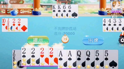 分牌:游戏中每张5、10、K都是分数,分别代表5分、10分、10分,两副牌共有200分。当玩家出的牌中有分数,任何一方都可以尽量出更大的牌,让其他玩家大不...