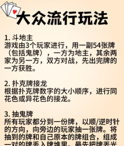 扑克牌游戏有多种玩法,如算卦、钓鱼、算二十四、斗地主、炸金花等,适合不同年龄段人群。部分玩法结合逻辑训练,帮助孩子理解数字排序和集合概念。