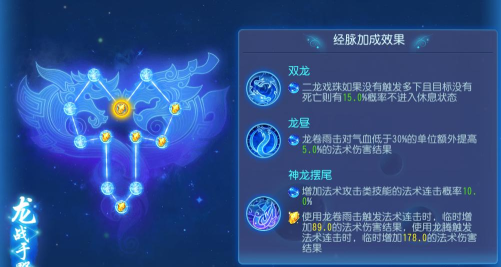 梦幻西游手游龙宫经脉系统主要围绕法伤、速度和防御展开,包括寒髓、潮息等经脉,可衍生出常规法伤龙、单挑点杀龙、外圈打蓝龙等多种流派,不同流派侧重不同技能强化,如龙卷雨击、龙腾、龙吟等。