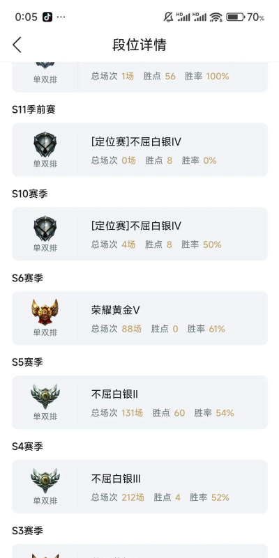 手游排位赛一共分为10个段位:坚韧黑铁、英勇黄铜、不屈白银、荣耀黄金、华贵铂金、流光翡翠、璀璨钻石、超凡大师、傲世宗师、最强王者. 定位赛 1.赛季初要打满10把定位赛,根据战绩结算排位等级,定位赛成绩越好,最...