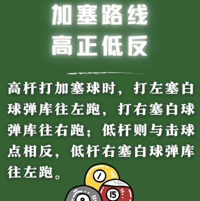 走位.这个地球人都知道,就不细说了. 解斯诺克.这个其实也是走位的一种. 薄贴库球.薄库边球对击打点要求比较精确,容易失误,但是如果加一个顺塞的话,成功率立马提升,谁用谁知道.我甚至打进过垂直的贴库球. 加、减速.这个技巧可能很多人没有注意到,在力度不方便妥协的时候(比如薄中袋球,薄贴库球等)可以通过加顺塞或者反塞来达到加、减速的目的. 2.如何加塞 3.注意事项 通常来说,加塞只有碰库之后才有效...