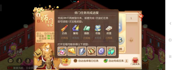 任务类型有拜访其他门派师傅,打扫门派XX,战斗类(如教训强盗/流氓),购买物资(其中购买装备及给到师傅需要确认),除开购装及额外师门任务外,其余均会自动引路完成,所以实际达成时间约为15分钟。