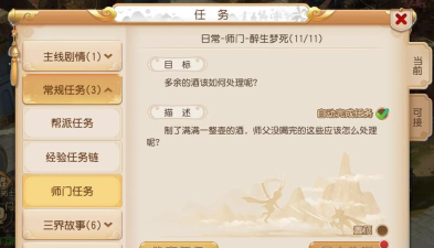 师门任务,作为常规活动中的第一项,主要产出以经验为主,辅以一定的银币与铜币收益.该活动相较其他常规或而言,具有最多的点击次数,但是由于相对战斗场次不多,所以耗时中等,能够较快完成.同时每日前20次完成能够提供高达一百点的活跃,是与捉鬼、竞技场四胜并列最高活跃收益的活动.