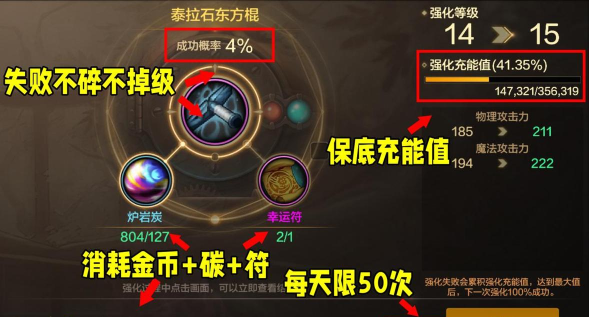 手游强化界面操作需遵循特定规则,如强化石优先给主武器强化,+10以上需搭配保护符与幸运符,避免装备破碎造成资源浪费。