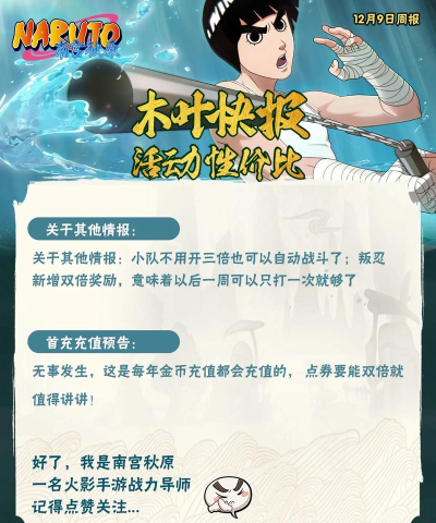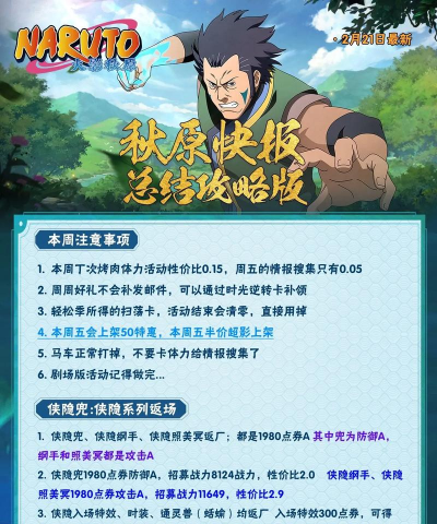 火影忍者手游周报通常包含最新版本更新、活动内容、新角色情报及平衡性调整等信息。近期更新涉及十周年活动调整、能量支援新活动及传说三忍自来也的特权商店下调等内容,玩家可关注官方公告获取详情。