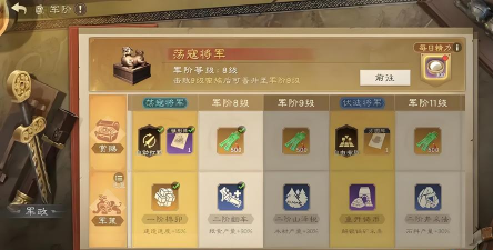 游戏初期,"诏令任务"(主线任务)是你最好的向导。它不仅指引你了解游戏功能,完成任务获得的丰厚资源(如金币、英豪令)和加速道具,这些道具对前期发展都很重要。另外军阶也是关键,通过挑战蛮族提升军阶,是开荒的核心玩法之一。军阶等级直接决定你能解锁哪些实用特权,对发展速度影响很大。