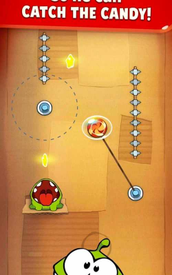 游戏采用了关卡挑战模式,总共为玩家们提供了五大区域的冒险,分别是空中城堡、蘑菇乐园、魔法森林、神秘洞穴 远古书库,每一个区域都有十多个关卡,玩家们需要完成关卡挑战获得星星评分,只有足够数量的星星评分才能解锁后面的地区.并且在操作上继承了经典的全屏滑动特性,玩家们主要通过手指滑动屏幕来切割绳子,也可以通过点击来按住一些特殊道具,然后绳子所绑住的糖果或者其它物品都会在自然重力的影响下而运动.