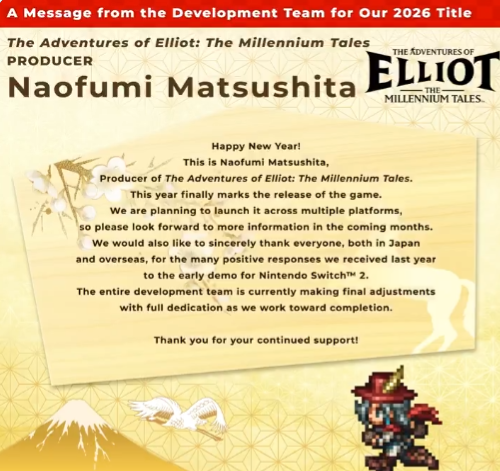 《冒险家艾略特的千年物语》预计将于2026年登陆Nintendo Switch 2、PlayStation 5、Xbox Series X|S,以及PC(Steam和Microsoft Store)。
