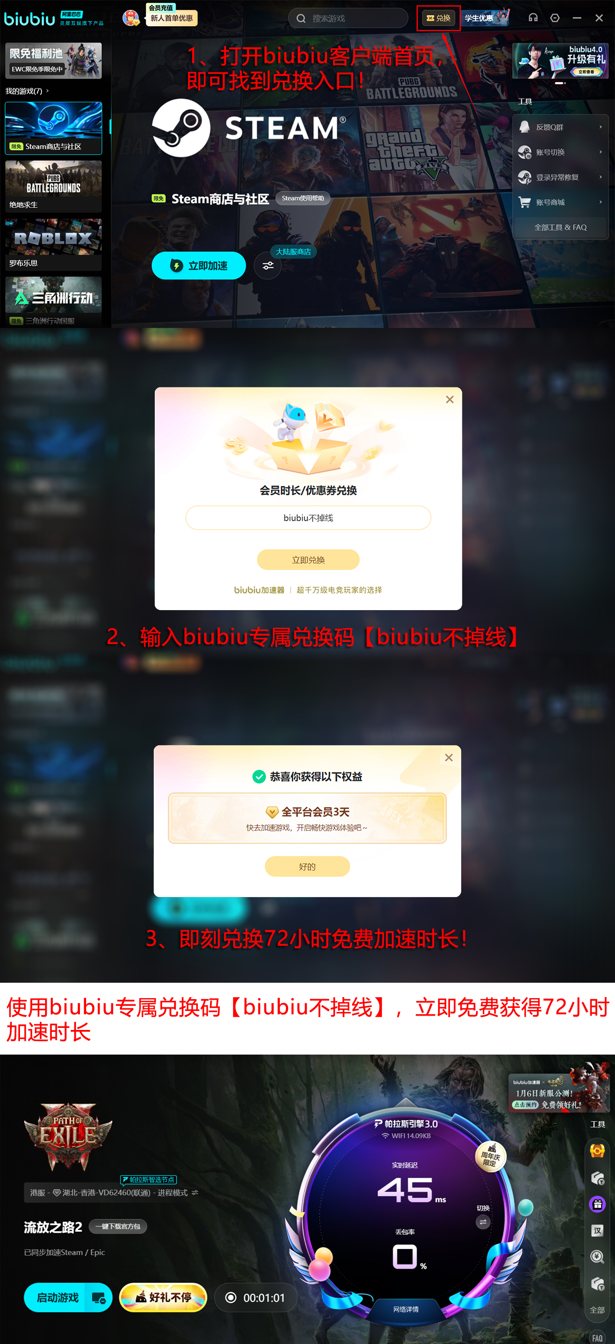 新用户注册即可激活24小时全功能试用权限。平台首页设有专属兑换入口,输入口令【biubiu不掉线】可额外领取72小时加速服务,叠加后新人总可用时长达96小时。同步适配Steam冬季特卖活动,自12月18日起至次年1月18日,biubiu开放全平台限时免费加速服务,并扩大限免支持的游戏列表范围,覆盖更多主流联机作品。