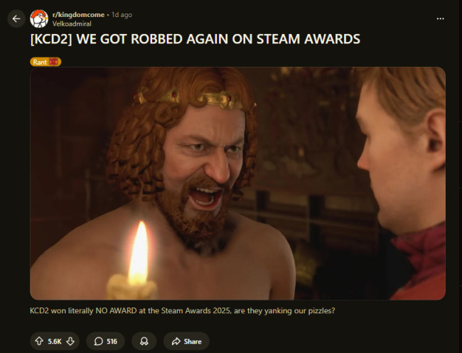 2025年Steam大奖,《天国:拯救2》获得了“年度最佳游戏”和“杰出剧情游戏奖”两项提名,原本很有希望获奖,但战马工作室再次空手而归。一名粉丝在Reddit上发帖怒斥:“我们又被抢了。他们这是在坑我们吗?”