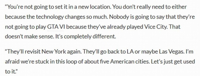 弗梅伊认为制作像《GTA》这样规模庞大的游戏所需的开发时间越来越长,再加上它与“讽刺性”的美国城市文化联系在一起,这意味着该系列游戏未来不太可能再次探索全球城市。