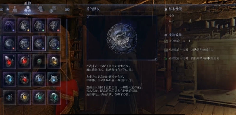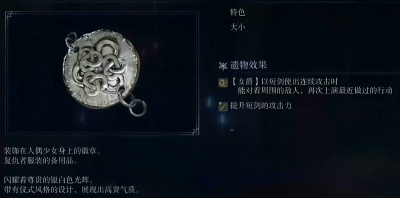 头冠的徽章效果是使用短剑连续攻击时能自动复现上一次行动,同时提高短剑百分之六的攻击力,直接强化普攻和战技伤害,让女爵的短剑攻击更有连贯性和杀伤力。祝福铁币是绝招发动期间命中敌人能提高攻击力,爵的黑夜是提升百分之十的处决伤害,配合匕首高处决倍率有很高收益,在BOSS破绽期借助这个戒指的增益能施展出致命一击,击败夜之王后能获取到。