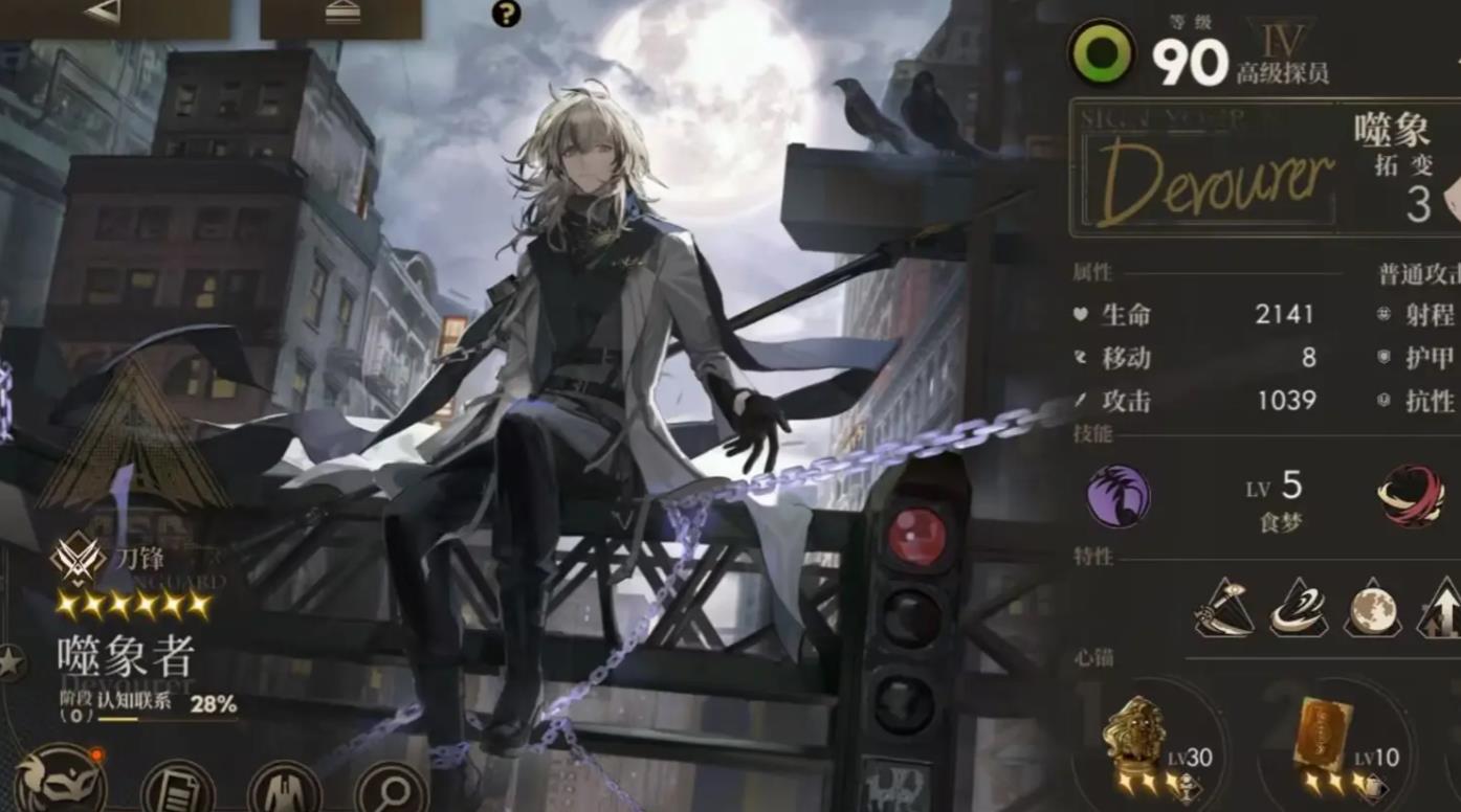 噬象者是神秘系的异能属性二段攻击的刀锋,可单攻可群攻,推荐所有玩家抽取。其封装体会让他能够无视属性造成克制,可以作为泛用性角色用于各种环境。技能和特性为所有队友提供12%的警戒威力,给可以警戒攻击的队友提供最多10%的攻击力,给敌人附加20%的易伤效果。技能一会给自己增加暴击增益,且不会结束行动,而技能二可增加穿透特性,并且是7乘以7格的超大范围群攻,这让噬象者具备有较强的群体输出能力。