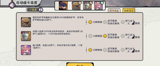 在这种选择方面,目前最多玩家使用的是攻击特效流、暴怒流、还有真气增伤流。先来看一下第一种攻击特效流,阵容选择是剑魔、狮子、兔子。神兵方面最优先的是三星擎天,然后是三星赤霄,最后是四星祝融。在卡组方面采用的是四风八土的组合。优先选择破天刀法、烈风斩、十面埋伏势和灵猴棍法等。释放设置是剑魔武学结束后释放,兔子和狮子立即释放。再来看暴怒流,暴怒的阵容组合是剑魔加云华,然后风系的夜叉或者是其他辅助,云华配合上三命的剑魔,怒气循环非常稳定。这套搭配的核心是在怒气充足的时候触发暴怒效果,打两张牌配合云华的回怒,实现高频率爆发。
