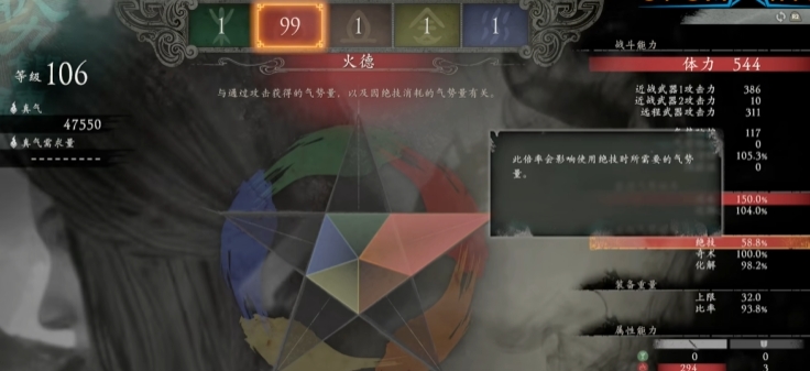 火德是一个偏向于主动攻击的属性,主要增加火属性伤害和攻击所获得的气势,减少绝技的气势消耗,奇术的种类大部分都是一些放火的技能和加伤害的buff,主修武器大多数都是矛和双戟。配点上体力是每级加三点,一共加两百九十多点,木德的优势在于能减少绝招的气势消耗,前二十级减少是最多的,主玩武器绝技的话可以把火德点到十五或者二十级。