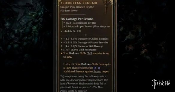 在《暗黑破坏神4》中,Bloodless Scream的出现为亡灵法师带来了新的构建选择。这把双手镰刀,不仅生成大量精华,还能冻结敌人,开辟了全新的战斗策略。Chill效果对亡灵法师而言是个难以触及的领域。