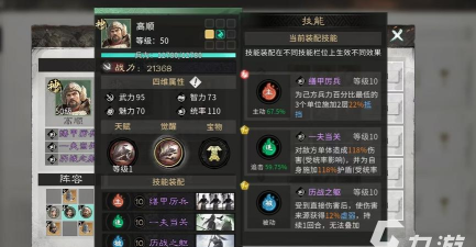在具体技能配合方面,高顺因为站到前排,所以以防御为主,小编选择的是缮甲利兵,一夫当关和历战之躯。其中主动技能是缮甲利兵,主要用于给己方施加抵挡。一夫当关是追击技能,对敌方单体造成伤害,自身施加护盾加强生存。历战之躯是被动,使得伤害来源可以获得虚弱,削弱对方输出。袁绍选择通权达变、反间计和兵无常势,黄月英选择临危不乱、医者仁心和兵不厌诈。