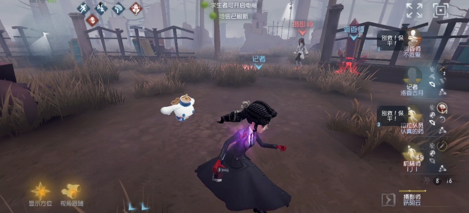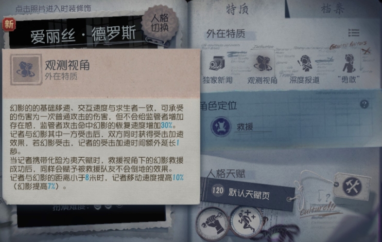 爱丽丝德罗斯被监管者普攻命中幻影也会有加速效果,当爱丽丝德罗斯和幻影的距离小于八米时两者都能获得移速加成,自身是百分之八,幻影是百分之五。爱丽丝德罗斯的相机有两种模式,第一种是牵制视角,也就是板子模式,该模式下生成的幻影会跑到没有放下的板子处停下,如果监管者处于可被砸板时幻影会自动放下板子然后消失,被幻影砸板命中的监管者眩晕时间会比较短。