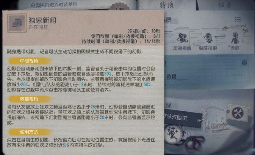 爱丽丝德罗斯主动技能是随身携带相机,可以通过点按或者长按蓄力的方式在指定位置召唤一个幻影,幻影的移动速度和交互速度跟普通求生者一样,能抗住一次普攻,也就是两次炸弹的伤害,监管者能将幻影打掉但不会提供存在感。监管者普攻打中幻影时擦刀所需要的时间会缩短,幻影被监管者打掉时爱丽丝德罗斯能获得受击加速的效果,同时持续时间额外增加一秒。