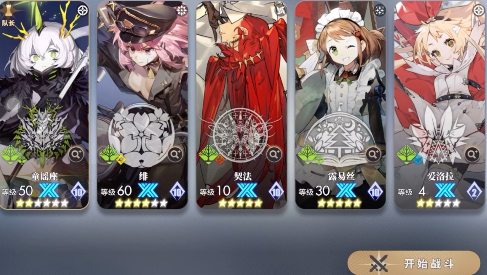 绯在队伍中不担任队长的情况下装备技能判定会出现被吞的情况,因此想伤害最大化绯一定要放在队长位,这样也能最大化利用每回合保底的居合状态打一些额外输出。绯更适合纯森队,目前由于森属性配队局限性较高,因此队伍的搭配主要以双短转为核心,首选三十针对大体积敌人的特攻队伍,由绯、契法、露易丝、艾蕾雅和那席里斯组成。