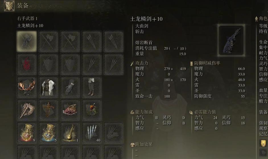 土龙鳞剑是重量为15的大型武器,在吃完力气B灵巧D信仰B后,总攻击力能达到一千零四十九点。攻击为物理与火属性混伤,其中物理伤害占据有六百九十八点,火属性伤害占据三百五十一点。装备时的必需能力值要求二十四点的力气,十五点的灵巧与十八点的信仰,属性对于新手要求较高,属于中期才能使用的武器。加点推荐低周目时只加力气与耐力就行,高周目的话就将力气与信仰全部都拉满,灵巧满足需求即可。