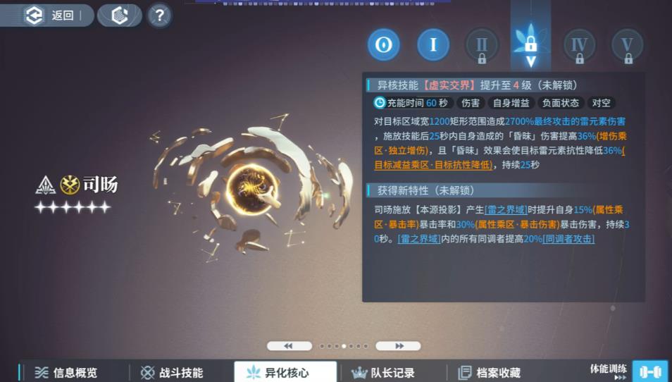 司旸比较适合组建御雀通信阵容,作为队长可提供全队刻印攻击,零花司旸和零花言雀搭配无罪之徒可降低84%雷抗。如果言雀零花司旸一花,降低雷抗效果为88%,如果言雀一花司旸零花即可达到99%。司旸的雷域可为言雀提供增伤,而烙痕失罪夜技能为元素之境,可为这两个角色同时提供暴伤和刻印攻击加成。言御可触发电解为司旸叠昏昧,同时具备暴击增益和护盾。