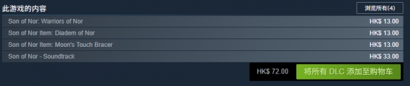 此外,游戏还有三个DLC和一个原声单独出售,总计72港币。