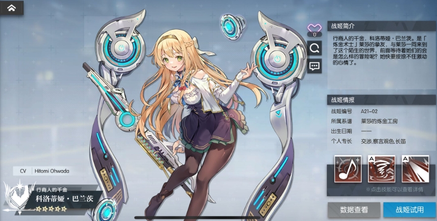 科洛蒂娅在莱莎和帕特莉夏体系中能作为战术值加速器和队长远程输出位,由于体系值增长快表现会明显强于非体系中的情况,强度在T1左右,要注意的是虽然科洛蒂娅也能享受战术体系的增益,但她不能使战术系统等级上限加一。科洛蒂娅的主动技是选择一个敌人造成百分之三百五倍率的伤害,目标格数越大造成伤害越高,是一个纯粹的输出技能。