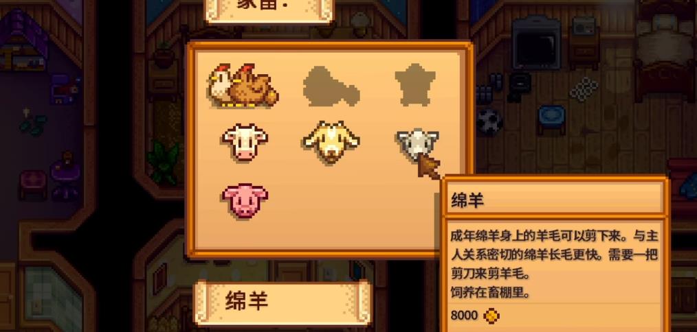 畜棚的位置建议建造在靠近家的位置来方便操作,绵羊在初期资金紧张的时候建议先买两只左右。还需要在畜棚外划出一片草地区域,用木材或者石头制作的围栏围起来,留一个门方便玩家进入。在区域内部可以播种在皮埃尔的杂货店购买草籽,这是绵羊在除冬季外其他三级的主要免费食物来源,能极大节省干草成本。