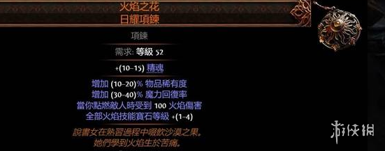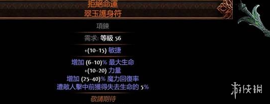 本攻略为玩家介绍了《流放之路2》中高价值传奇装备项链,比如拒绝命运,遭遇敌人击中前回复掉血的5%,55e最低价,而且数量不多。火焰之花,点燃敌人的项链,现在炒起来了,50-60e起步。