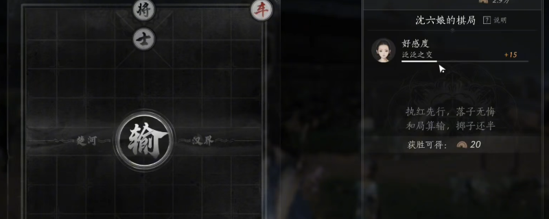 《燕云十六声》中可以玩的小游戏的数量是非常多的,下象棋就是其中一种,而想要通过下象棋刷好感是很难的,直接认输只能提升五点,赢了则只能获得十点,还非常麻烦,不过你只需要把帅给他吃就可以提升十五点。