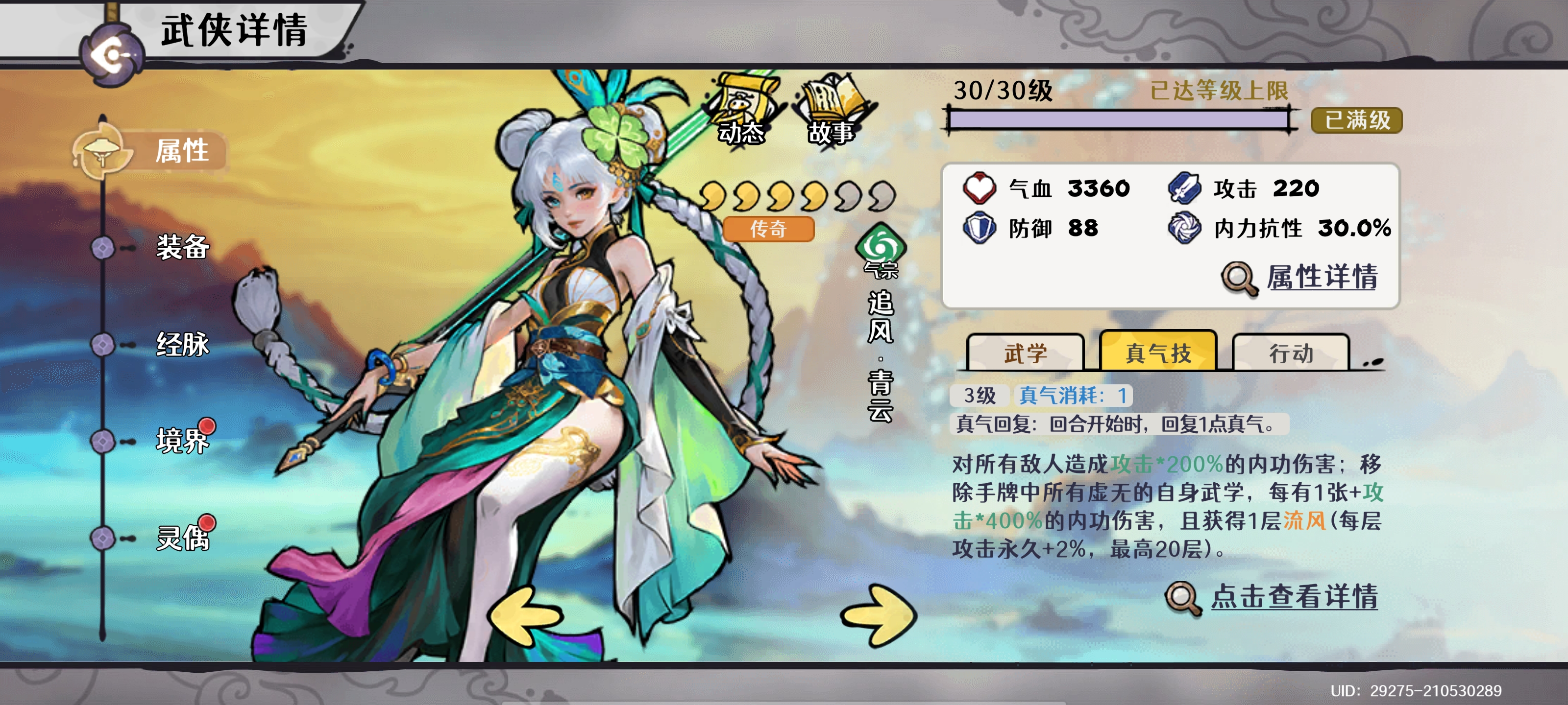 首先新武侠爆追队核心输出就是追风青云武学的打出,消耗虚无武学后输出能力大大降低,所以真气技能一般都是用来收尾,并给后续回合提高成长性。流风buff20层上限,而一回合的一般上限为10张,而且绝不部分情况打不到的。