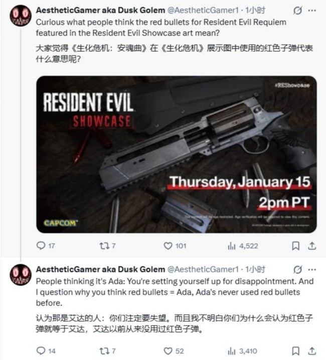 关于红色弹壳的猜测,也牵连出玩家对于新作角色的种种推断。此前有部分玩家因“红色”联想到艾达·王,但知名业界爆料人AestheticGamer(又称Dusk Golem)迅速否定了这一关联,指出“艾达从未使用过红色弹药”,并提醒以此推测角色登场“可能会失望”。目前,更有传言指向另一位经典角色——克莱尔·雷德菲尔德可能登场,但此说法尚未得到任何官方证实。