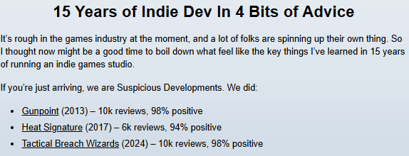 ·Tom Francis已经有了15年的游戏开发经验,曾经推出过多款卖座游戏,重点是游戏完成后必须要获得合理收益,才能支撑后续新游戏的继续开发,想要成功,或许先要学习下前辈的经验。