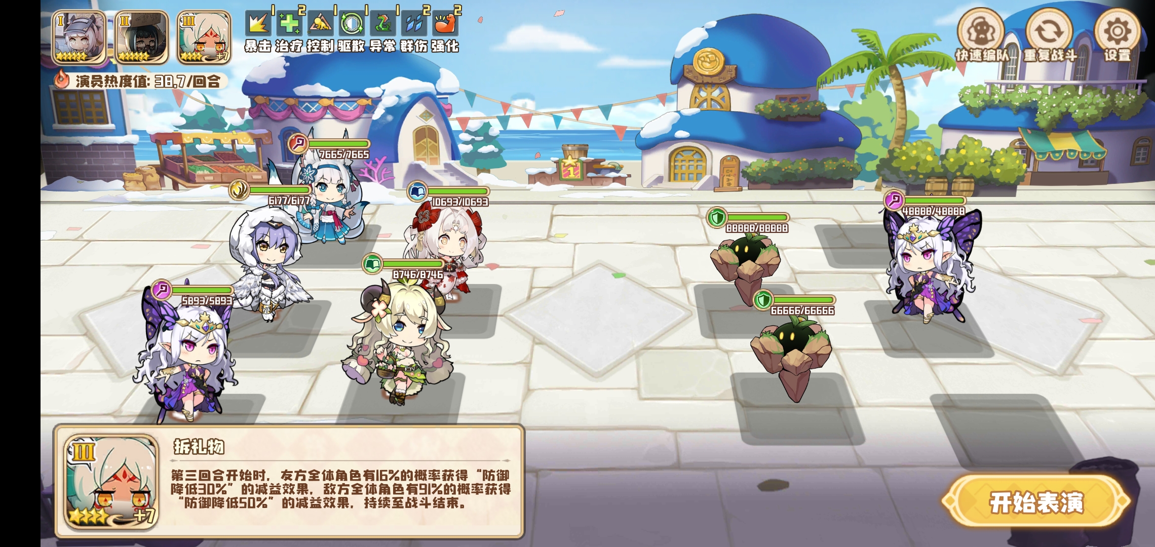 活动最后一关剧照建议带拆礼物3,减防效果会一直持续到战斗结束,其他两张不建议带偷心其他可以自己安排,带偷心练度不够对面奶的速度绝对比你打的快,角色的话能带个白鸟能标记对面蝴蝶,只要秒了蝴蝶后面就很简单了