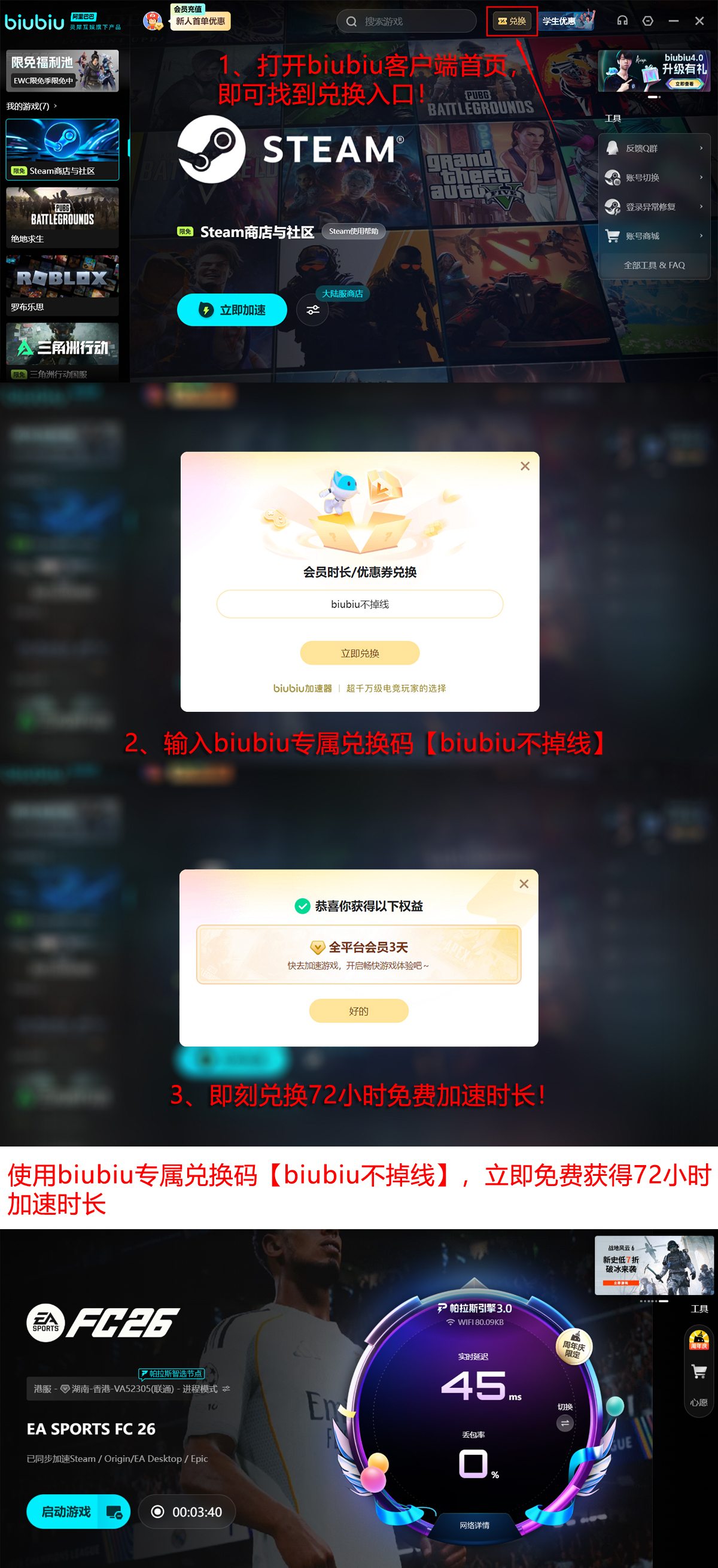 新用户注册即赠24小时使用权限。完成注册后输入激活码【biubiu不掉线】,额外获得3天时长,总计可享96个小时免费服务,成本效益显著。