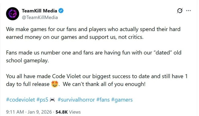 近日TeamKill Media官方发推文回应了差评争议,称他们打造《Code Violet》是为了真正花钱购买产品的粉丝和玩家,而不是为了批评者。开发团队还庆祝了游戏表现,并透露《Code Violet》是他们迄今为止最成功的作品。