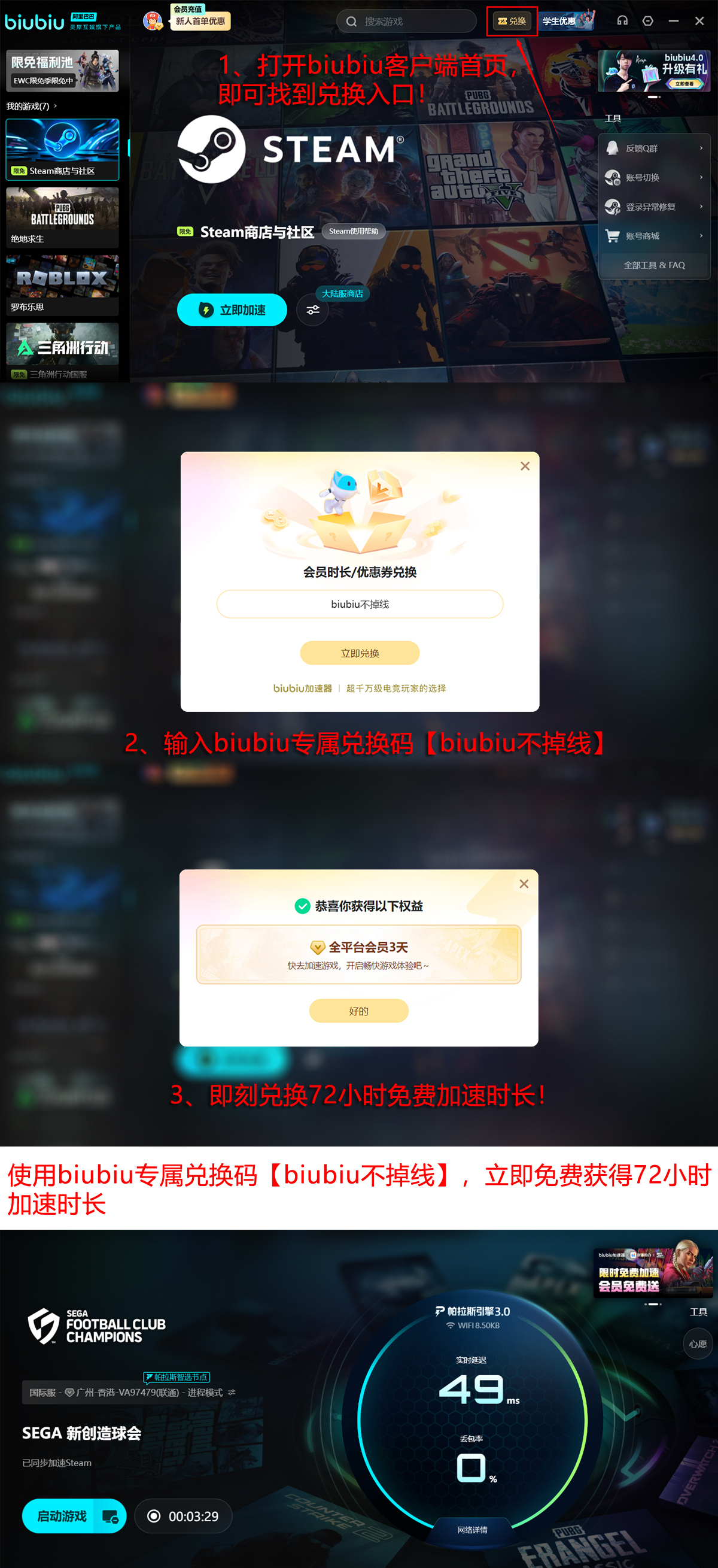 面向新用户,biubiu平台同步推出专属入门激励:完成注册后即可获得24小时全功能免费试用;输入激活码【biubiu不掉线】,还可额外解锁72小时高级加速权限。两项叠加,新玩家可无缝享受总计96小时无限制加速服务,充分体验SEGA新创造球会的竞技节奏与战术深度。
