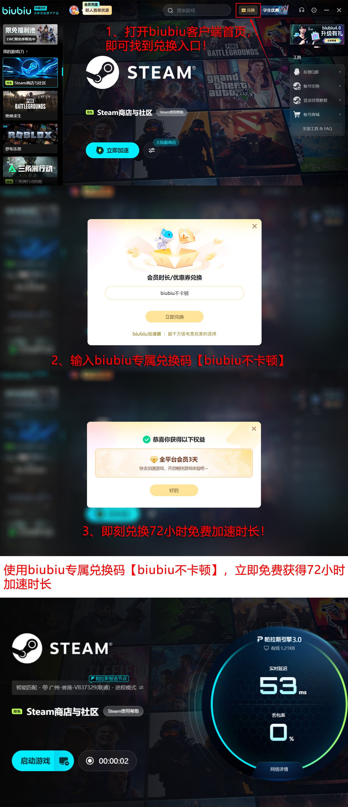 针对新用户,Biubiu提供零门槛体验策略:完成首次账号注册即可获赠24小时全平台通用加速时长,覆盖PC端所有支持游戏;此外,输入专属兑换码【biubiu不卡顿】还可额外激活3天连续使用权,总计最长可达96小时免费体验周期。该权益无需绑定设备或支付信息,充分保障试用自主权,帮助用户客观评估服务适配性后再做长期使用决策。