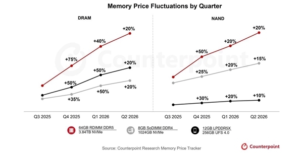 在这种情况下,预计2025年Q4存储价格将飙升40%–50%;2026年Q1还将再涨40%–50%,2026年Q2预计再上涨约20%。