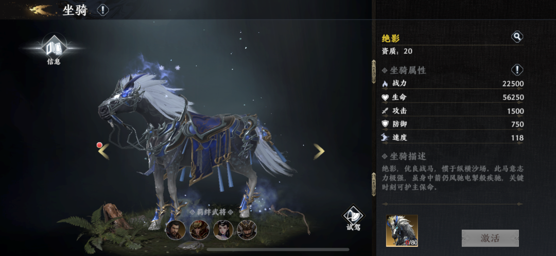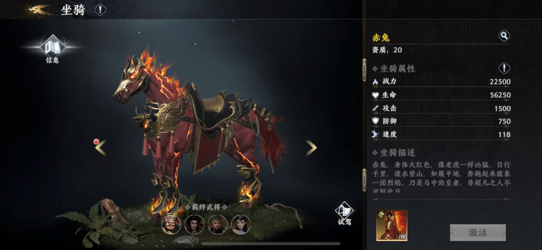 4、兑换商城:活动开启期间可使用神驹徽章兑换商城内的道具,限定兑换的次数仅对本次活动周期内生效;本次活动最值得兑换的那肯定是80碎片激活的绝影与80碎片激活的赤兔,都是20资质得存在,闯荡天下必备。