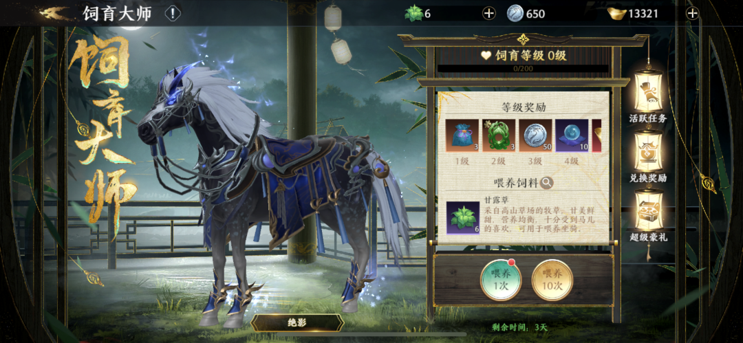 3、活跃任务:活动开启期间可通过完成特定的任务来获得奖励。任务:饲育大师每天登陆连续三天即可获得甘露草和元宝;饲育大师通过经典战役次数分别为2/4/6次获得甘露草和铜钱;饲育大师通过完成谁与争锋次数3/6/10次获得甘露草和突破丹;饲育大师通过骏马寻宝的次数10/20/30次获得奖励甘露草和强化石;饲育大师通过势力捐献的次数10/20/30次获得甘露草和经验丹;
