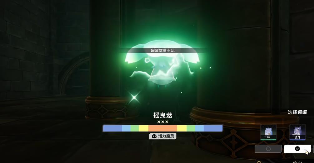 在捕捉过程中需要使用到罐罐,分为绿色、蓝色、紫色的品阶,其中绿色是免费且不限量使用的,蓝色和紫色则是需要自己制作,以后有可能会更为稀有的金色。在捕捉时左边的能量条代表捕捉的成功率,右边则是选择使用的罐罐,期间会指针在成功率条上移动,需要在合适的时机按下投喂按键。