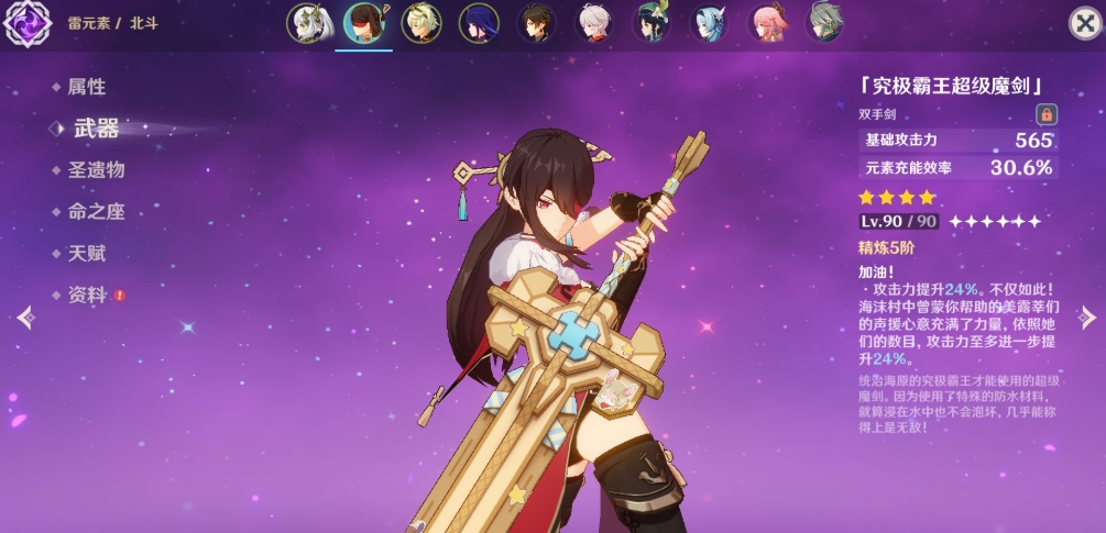 迪卢克携带提升也不大,当他的暴击率达到百分之九十,暴伤达到百分之一百八十多时伤害期望才能达到百分之九十左右。北斗携带同样没有表现出多少优势,究极霸王超级魔剑是充能词条攻击模组的武器,可以当成充能合适的西风大剑上位,在输出上要优于西风大剑,但没有西风大剑拐全队充能的辅助能力。因此综合来看这把武器还是只有获取简单和精炼比较容易这两个优点,只能作为部分双手剑角色的过渡武器。