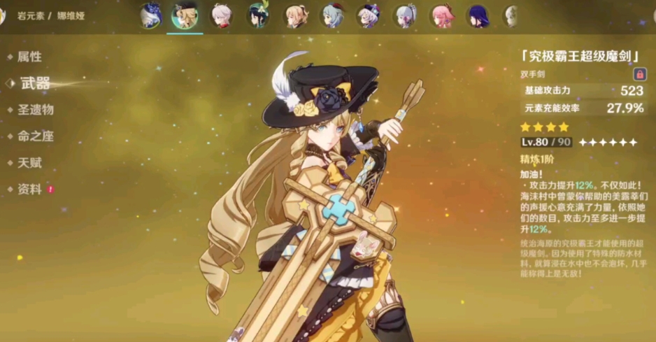 九十级究极霸王超级魔剑基础攻击力为五百六十多,在所有四星武器中白值属于较高的一档,副属性是百分之三十左右的元素充能效率,被动是提升攻击力,精炼五阶后能触发全部特效,提供百分之四十多的攻击力加成。但这把武器对比之前的活动武器来说被动的获得要苛刻一些,需要完成六个跟美露莘相关的任务才能获得攻击力的提升。