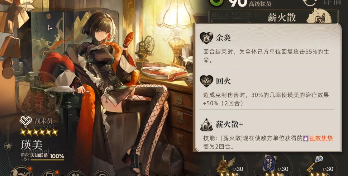 瑛美在实战的时候只需要注意保证自身生存,以及在使用一技能时尽量不击杀敌人即可。她的封装体薪火散,让其在每个回合开始强化距离自己六格内的队友,并给最远的敌人挂上强效焦热。获得增益的队友在一回合内技能威力加10%,受到的远程伤害减10%,而最远的敌人则会在回合开始时受到强化焦热的伤害。该状态持续时间为一回合,等将瑛美升到70级3破后便会变为持续两回合。