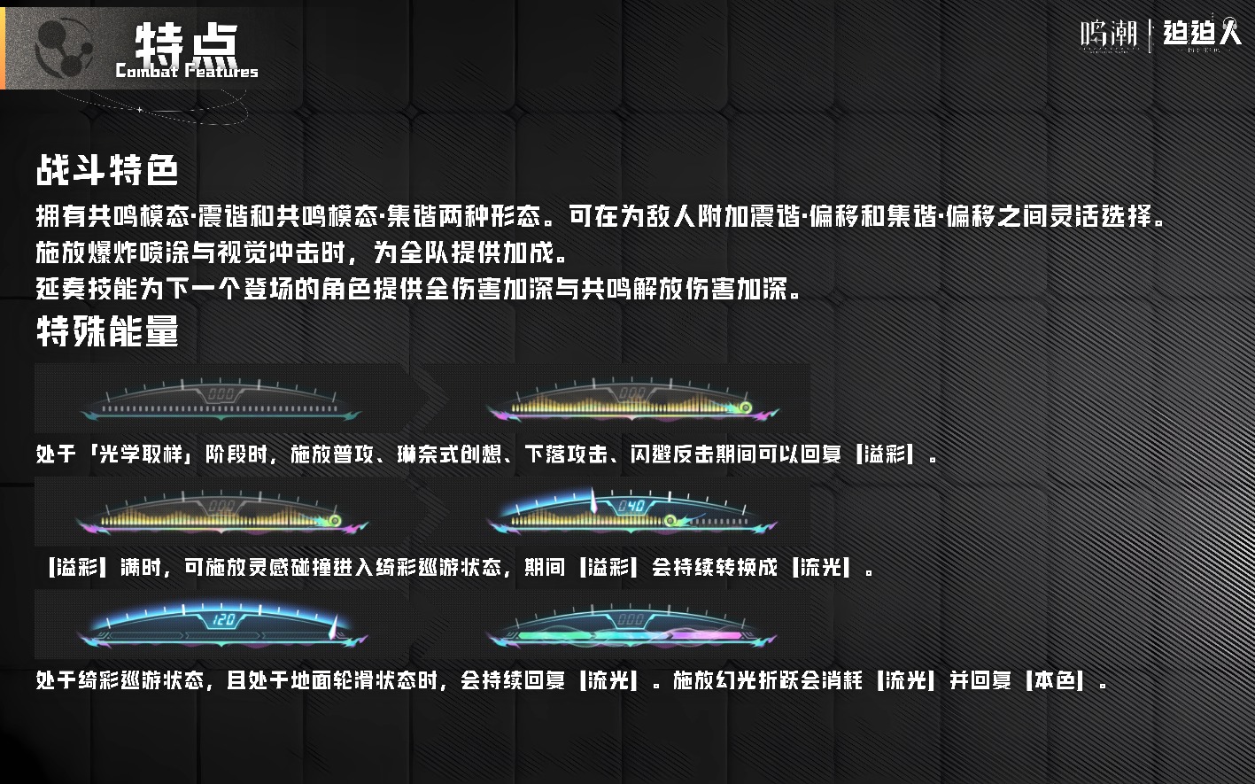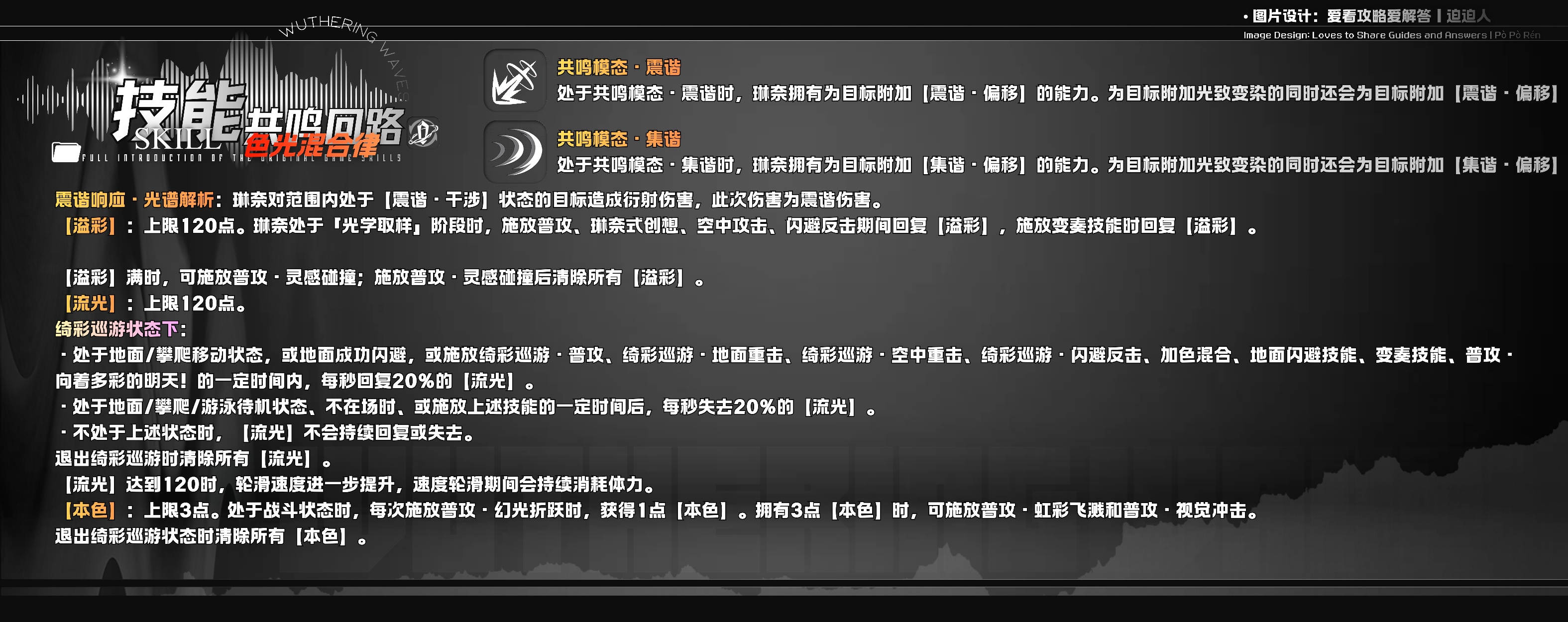 简要整理一下:琳奈在溢彩满120点时,长按普攻触发普攻·灵感碰撞,在松开或溢彩耗尽后会进入绮彩巡游状态。绮彩在巡游状态下时,若琳奈处于地面移动状态或施放特定技能的一定时间内,还会持续回复【流光】。绮彩巡游状态下的资源,移动、普攻、E技积攒攒【流光】,在满40后就能跳起来放【幻光折跃】,最多可连放3次,每放一次得1点【本色】上限是3点。满3点【本色】后空中再按普攻,可释放【视觉冲击】,为命中的目标附加光致变染,并使附近队伍中所有角色的谐度破坏增幅提升40点,持续30秒。